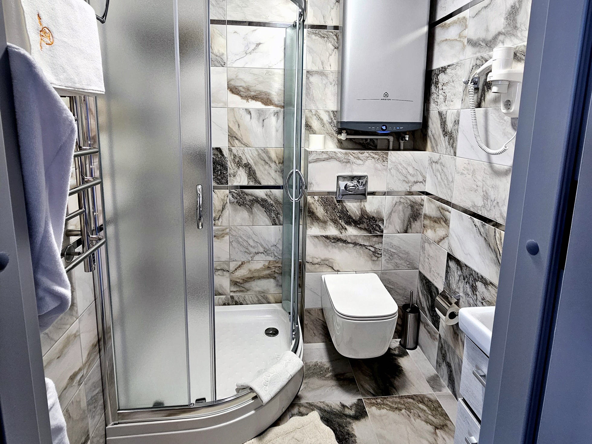 Двуспальная кровать с системой комфортного сна, сплит-система, комфортная рабочая зона с рабочим местом, журнальный столик, кресло, мягкий диван, холодильник, ЖК-телевизор, кабельное ТВ, сейф, ванная комната с душем и профессиональным феном, туалетно-косметические принадлежности, тапочки, халаты, чайный набор (чайник, посуда, бутилированная вода, чай, кофе, сахар).