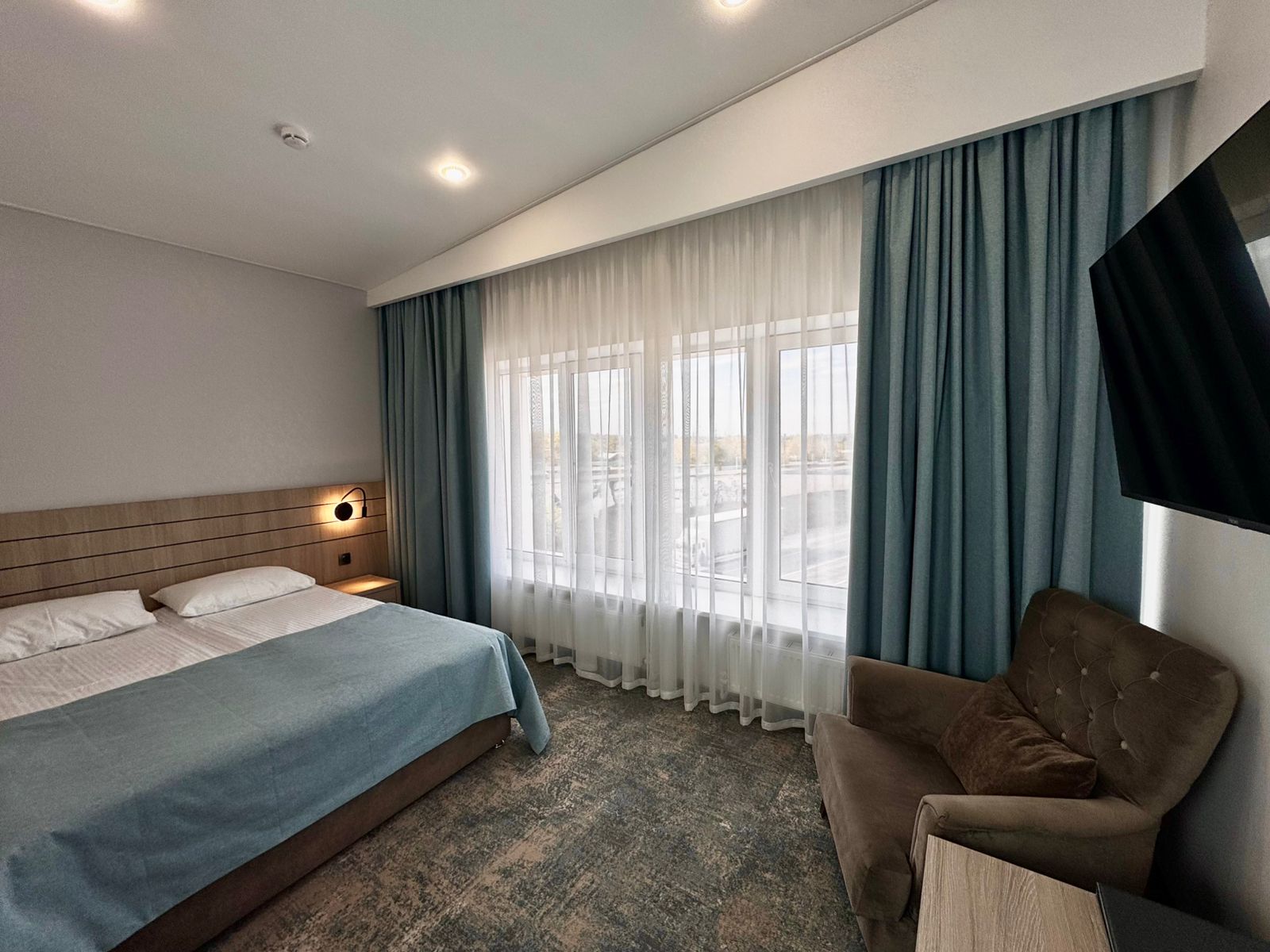 Двухкомнатный комфортный номер. Кресло с журнальным столиком создают удобное пространство для работы и досуга. Площадь номеров 25-28 м2