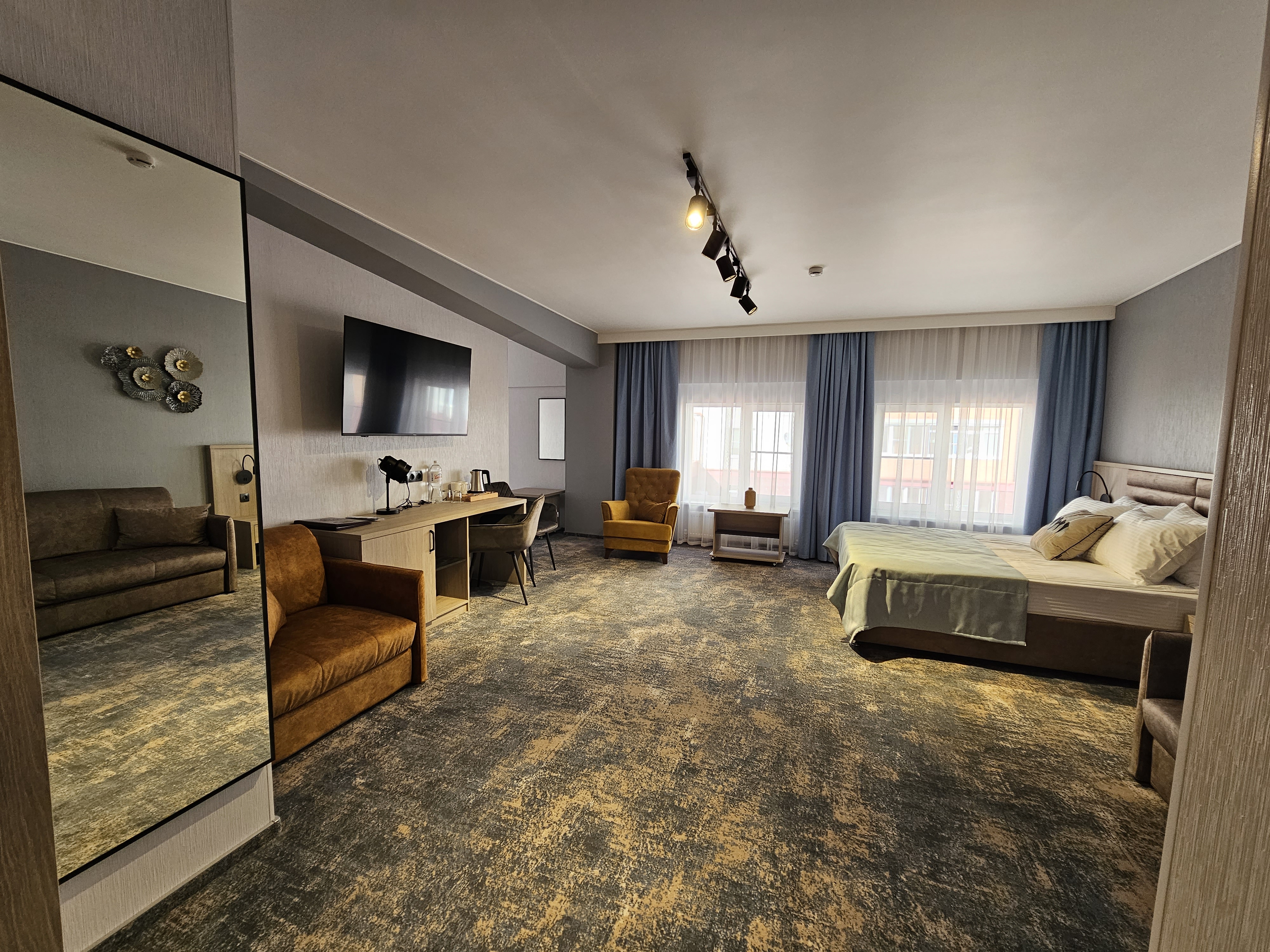 Двуспальная кровать с системой комфортного сна, сплит-система, комфортная рабочая зона с рабочим местом, журнальный столик, кресло, мягкий диван, холодильник, ЖК-телевизор, кабельное ТВ, сейф, ванная комната с душем и профессиональным феном, туалетно-косметические принадлежности, тапочки, халаты, чайный набор (чайник, посуда, бутилированная вода, чай, кофе, сахар).