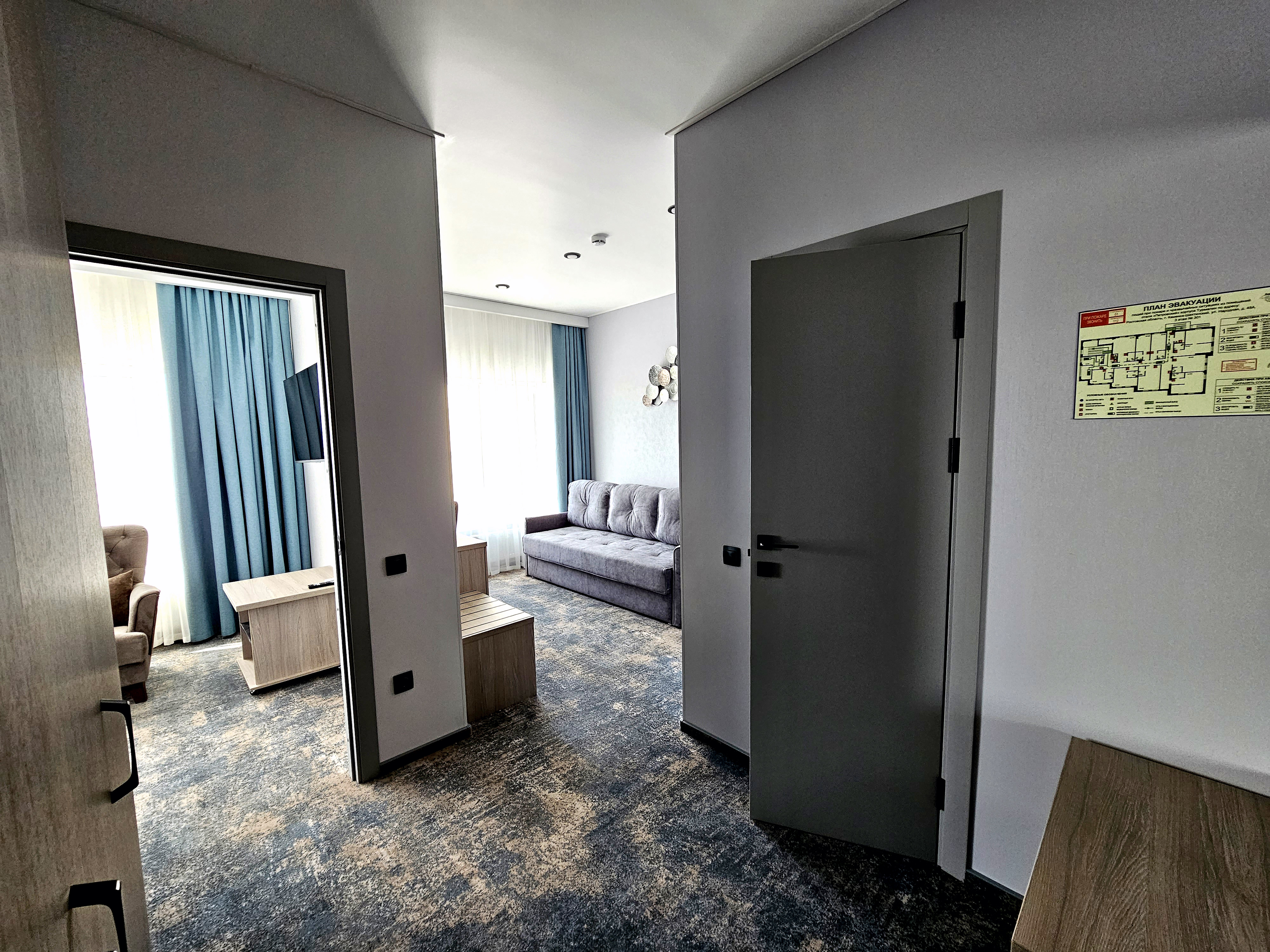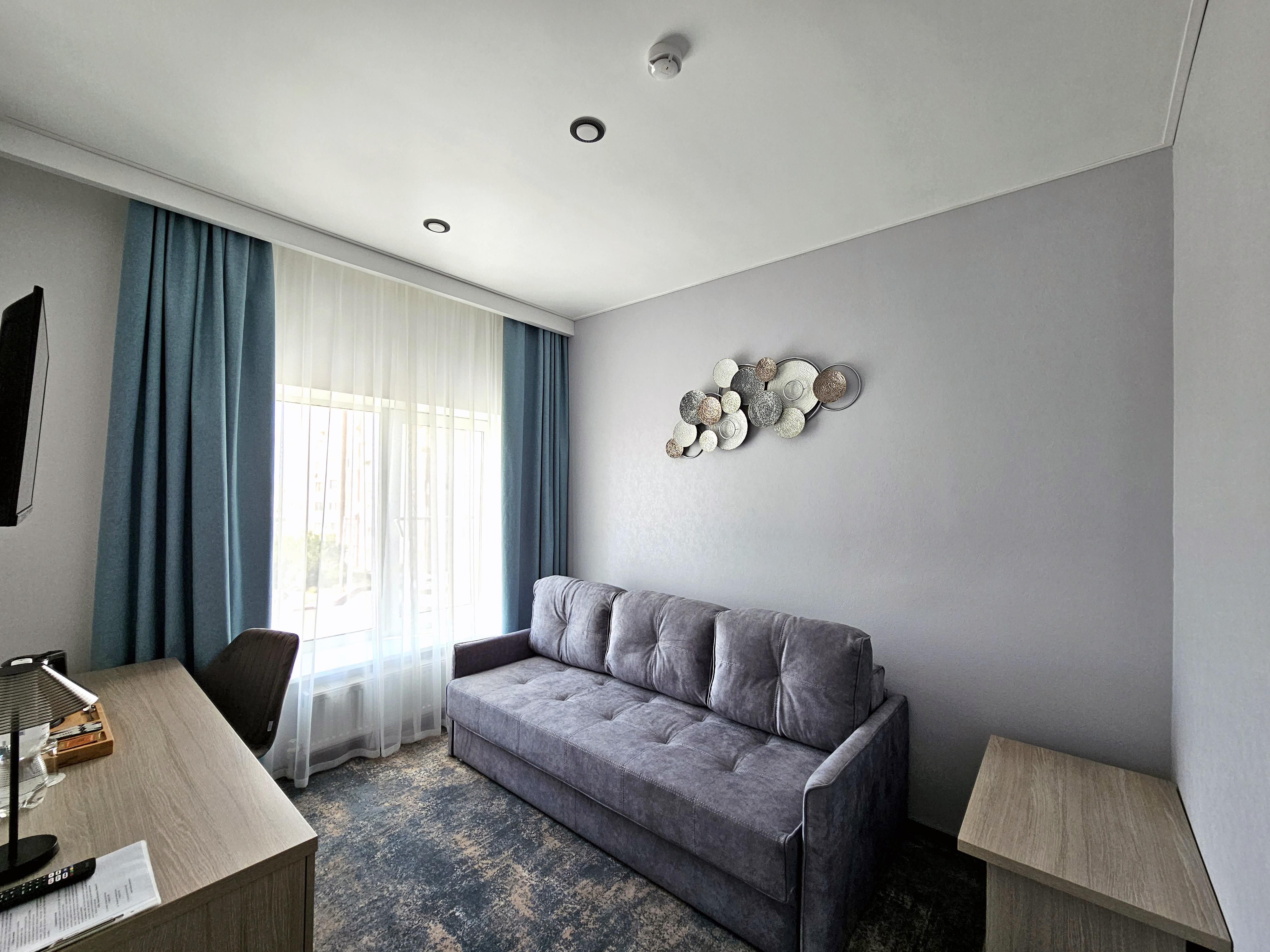 Двухкомнатный комфортный номер. Кресло с журнальным столиком создают удобное пространство для работы и досуга. Площадь номеров 25-28 м2