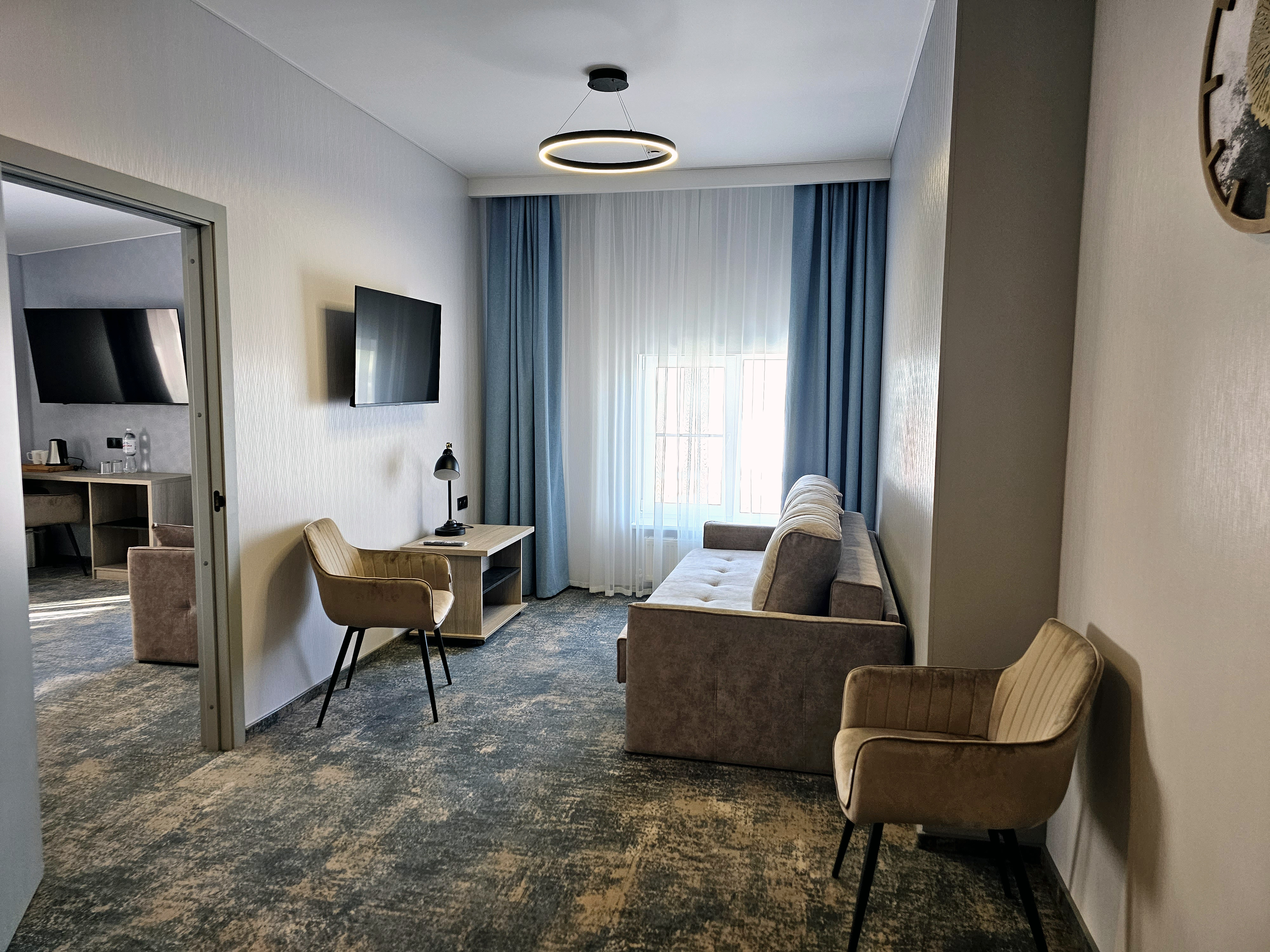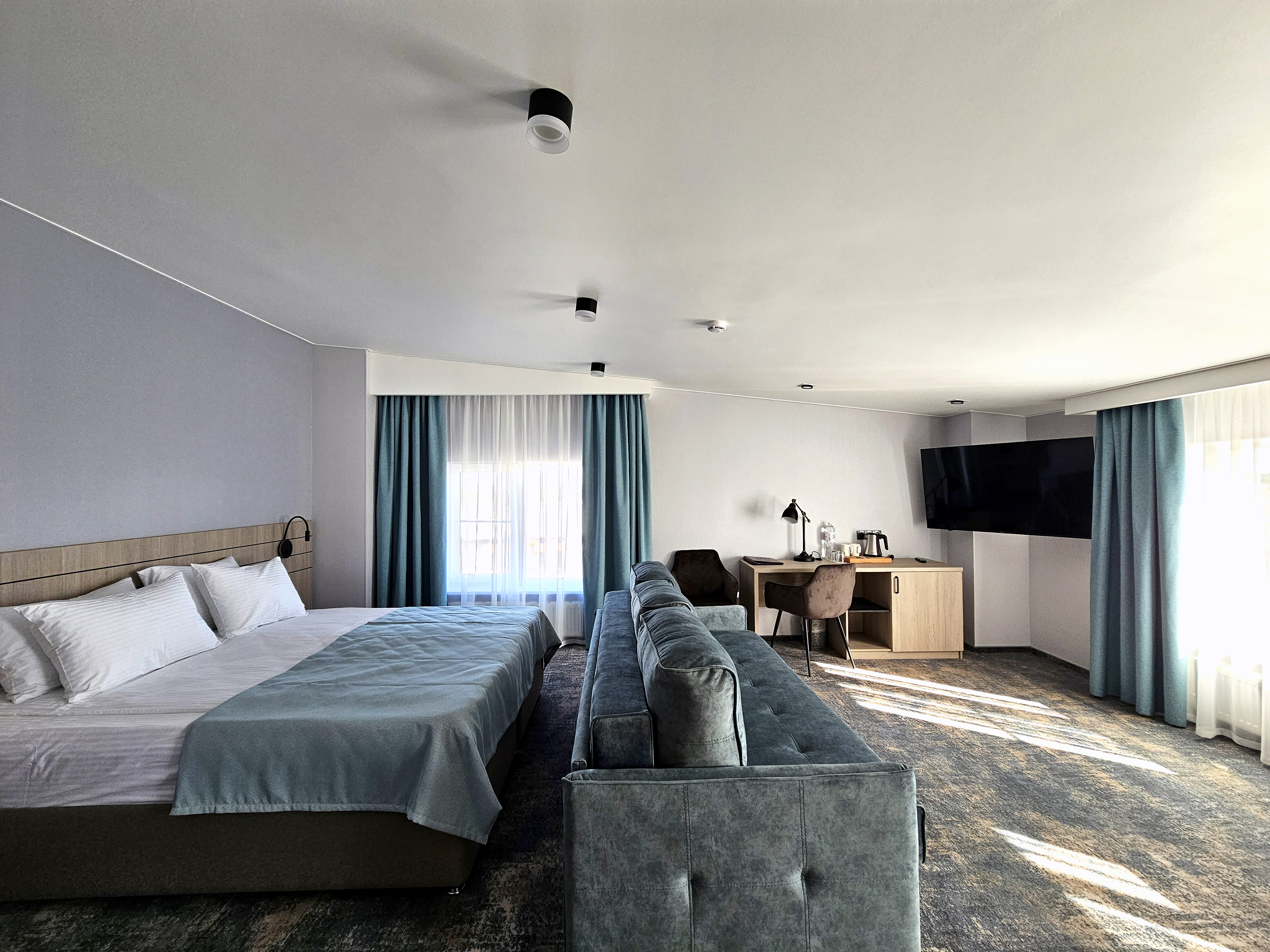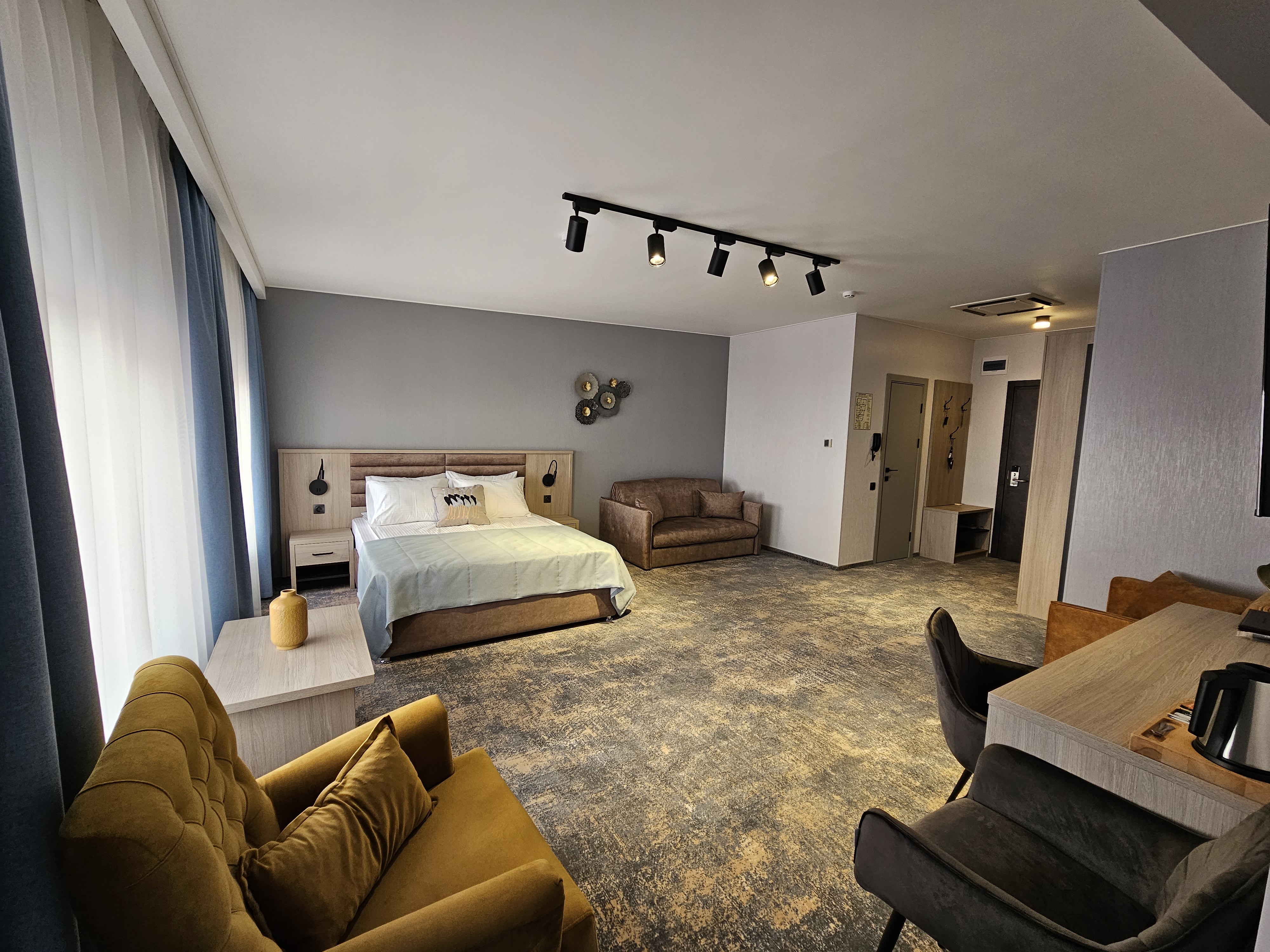 Двуспальная кровать с системой комфортного сна, сплит-система, комфортная рабочая зона с рабочим местом, журнальный столик, кресло, мягкий диван, холодильник, ЖК-телевизор, кабельное ТВ, сейф, ванная комната с душем и профессиональным феном, туалетно-косметические принадлежности, тапочки, халаты, чайный набор (чайник, посуда, бутилированная вода, чай, кофе, сахар).