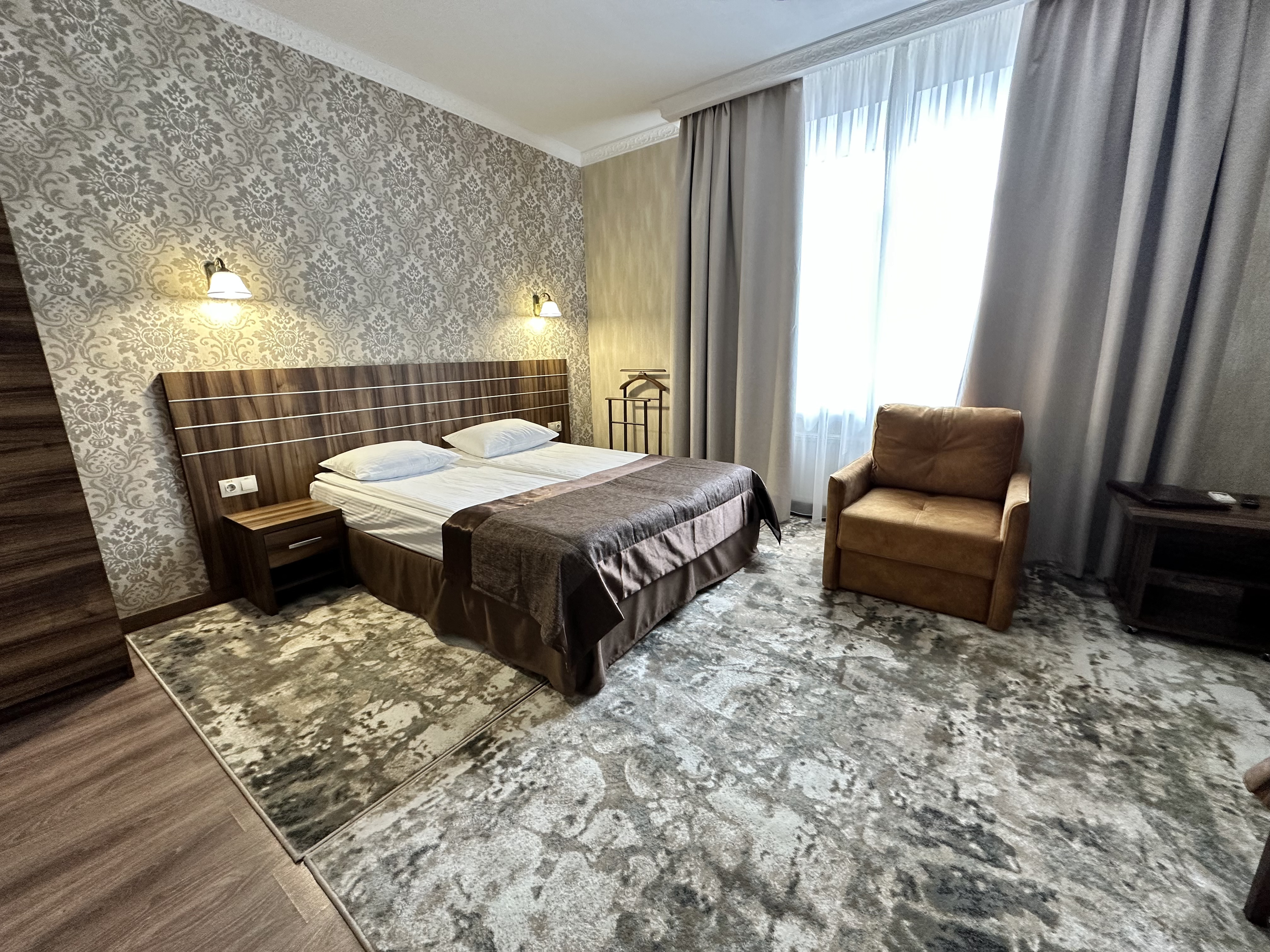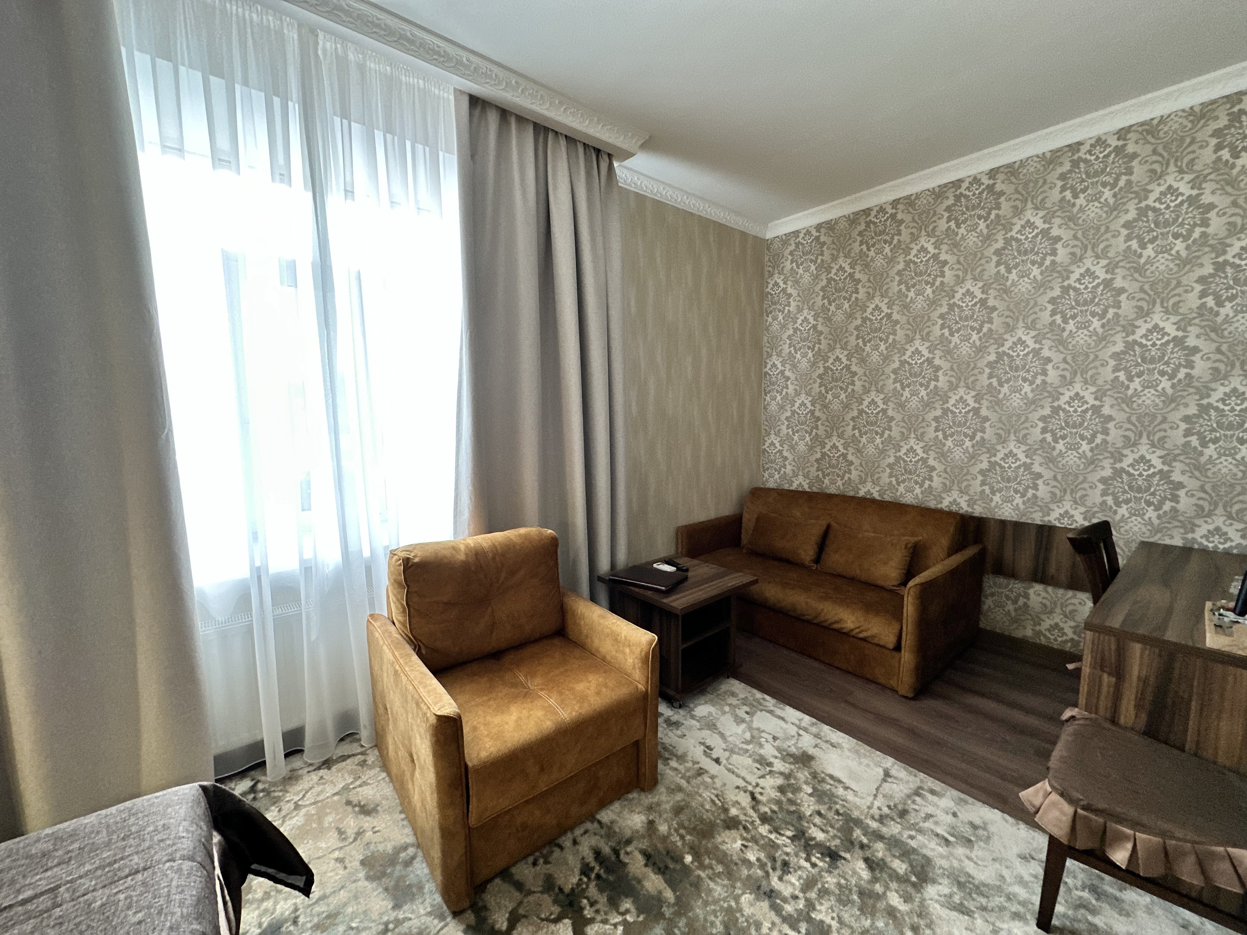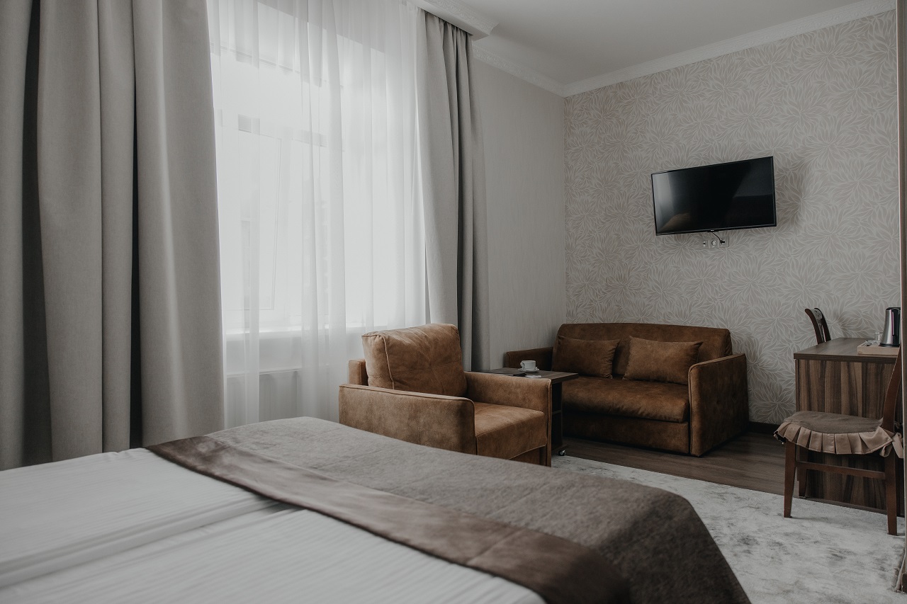 Уютные и комфортные номера. Кресло с журнальным столиком создают удобное пространство для работы и досуга. Площадь номеров 25-28 м2