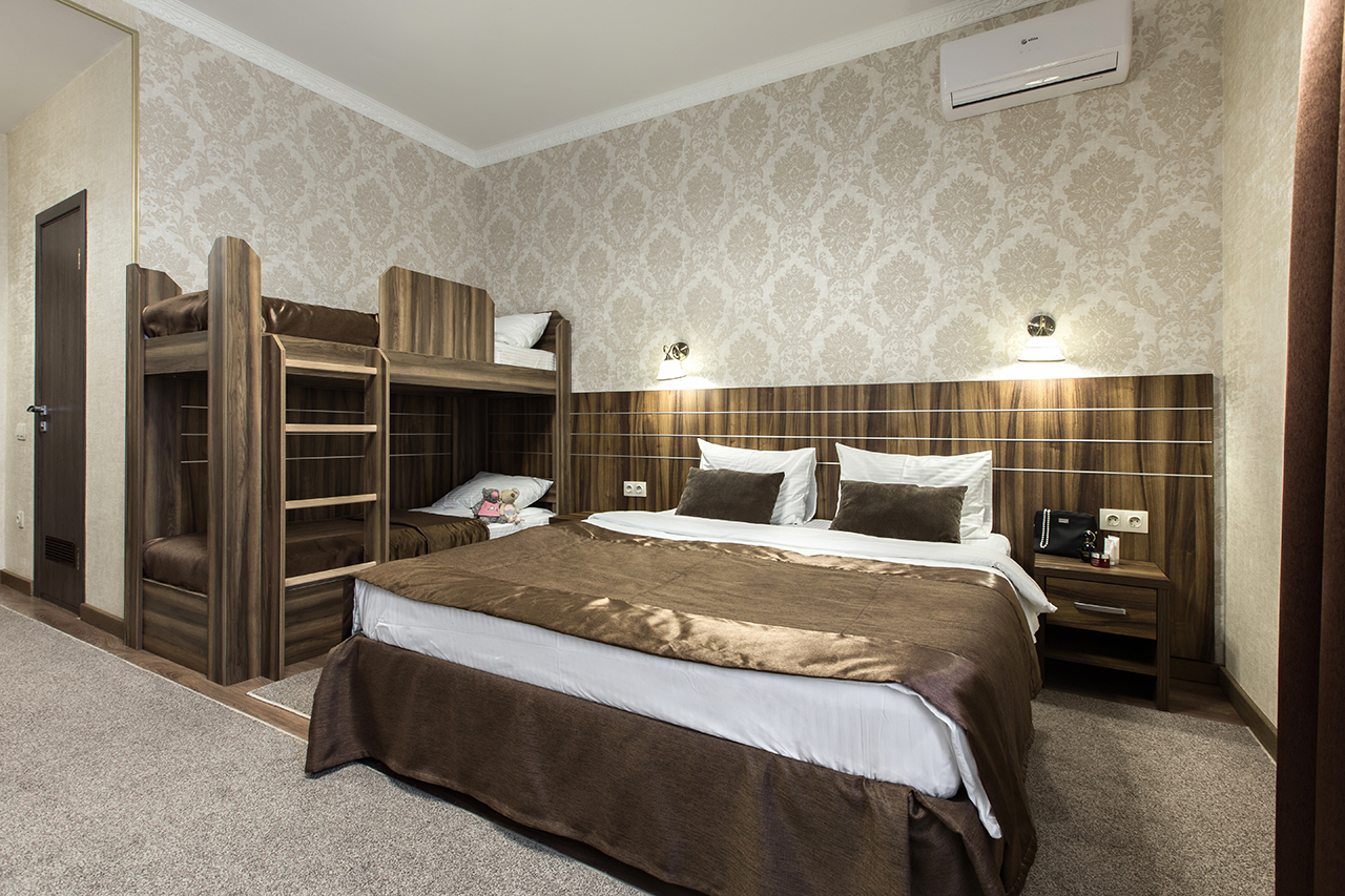 Предусмотрено до 3-х дополнительных спальных мест. 1. Одна дополнительная кровать и диван-кровать (при размещении на диван-кровати двух детей в возрасте до 10-ти лет, или одного взрослого и одного ребенка в возрасте до 10 лет).2. Двухъярусная кровать и кресло-кровать (при размещении на двухъярусной кровати двоих детей или двоих взрослых весом до 70-ти кг, и размещении на кресле-кровати одного ребенка в возрасте до 10 лет). Стоимость одного дополнительного спального места с завтраком - 1000 руб. Детские кроватки и стульчики предоставляются бесплатно по запросу.