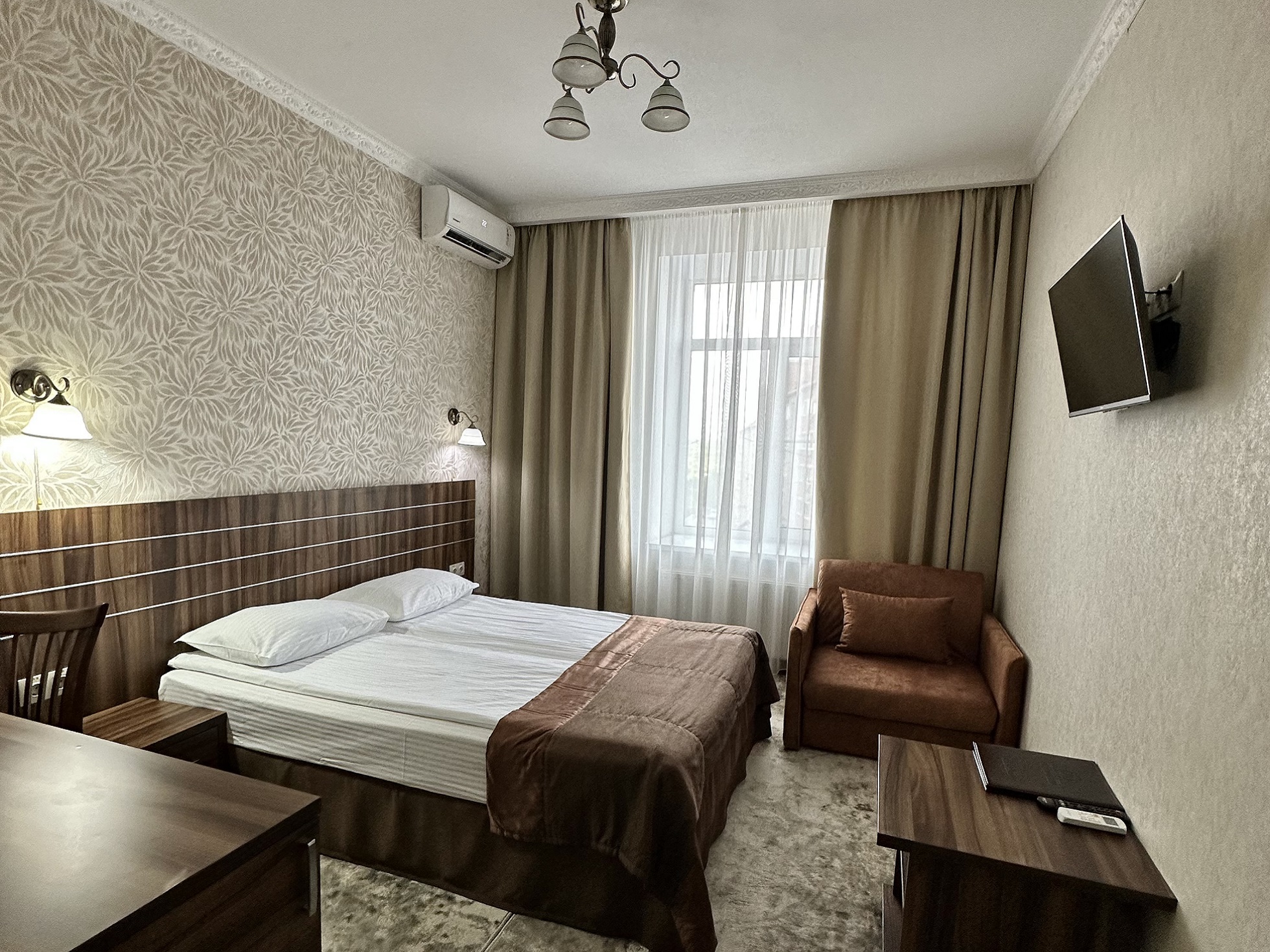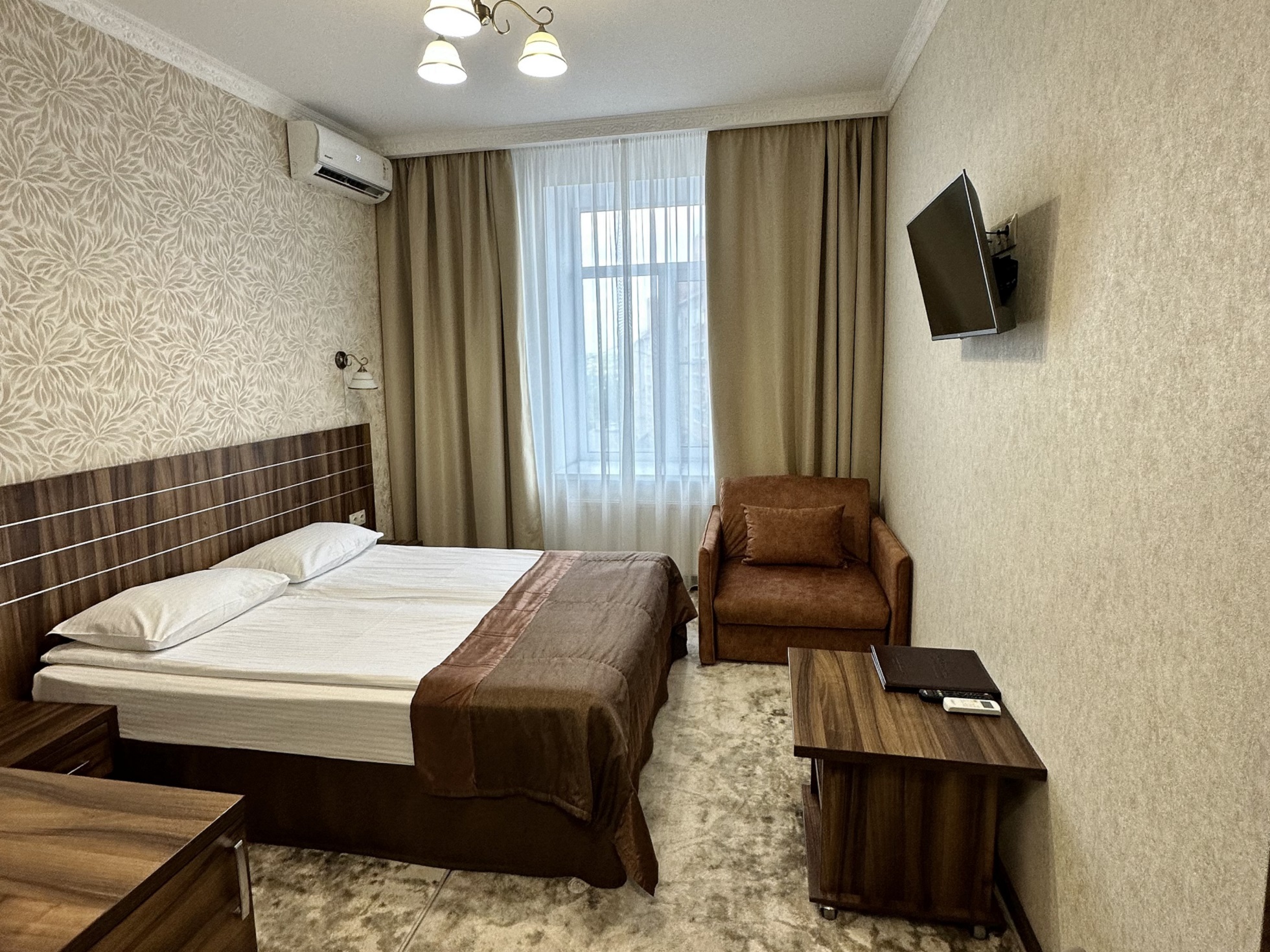Улучшенный двухместный номер стандарт. Кресло с журнальным столиком создают удобное пространство для работы и досуга. Площадь номеров 25-28 м2